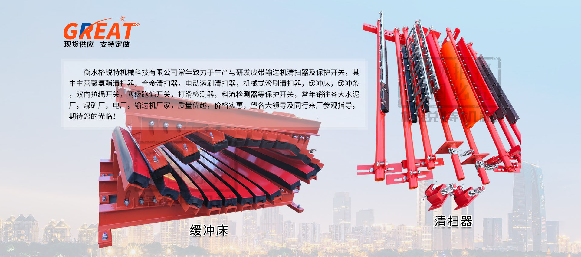 衡水格銳特機械科技有限公司常年致力于生產與研發皮帶輸送機清掃器及保護開關,其中主營聚氨酯清掃器,合金清掃器,電動滾刷清掃器,機械式滾刷清掃器,緩沖床,緩沖條,雙向拉繩開關,兩級跑偏開關,打滑檢測器,料流檢測器等保護開關,常年銷往各大水泥廠,煤礦廠,電廠,輸送機廠家,質量優越,價格實惠,望各大領導及同行來廠參觀指導,期待您的光臨!??!